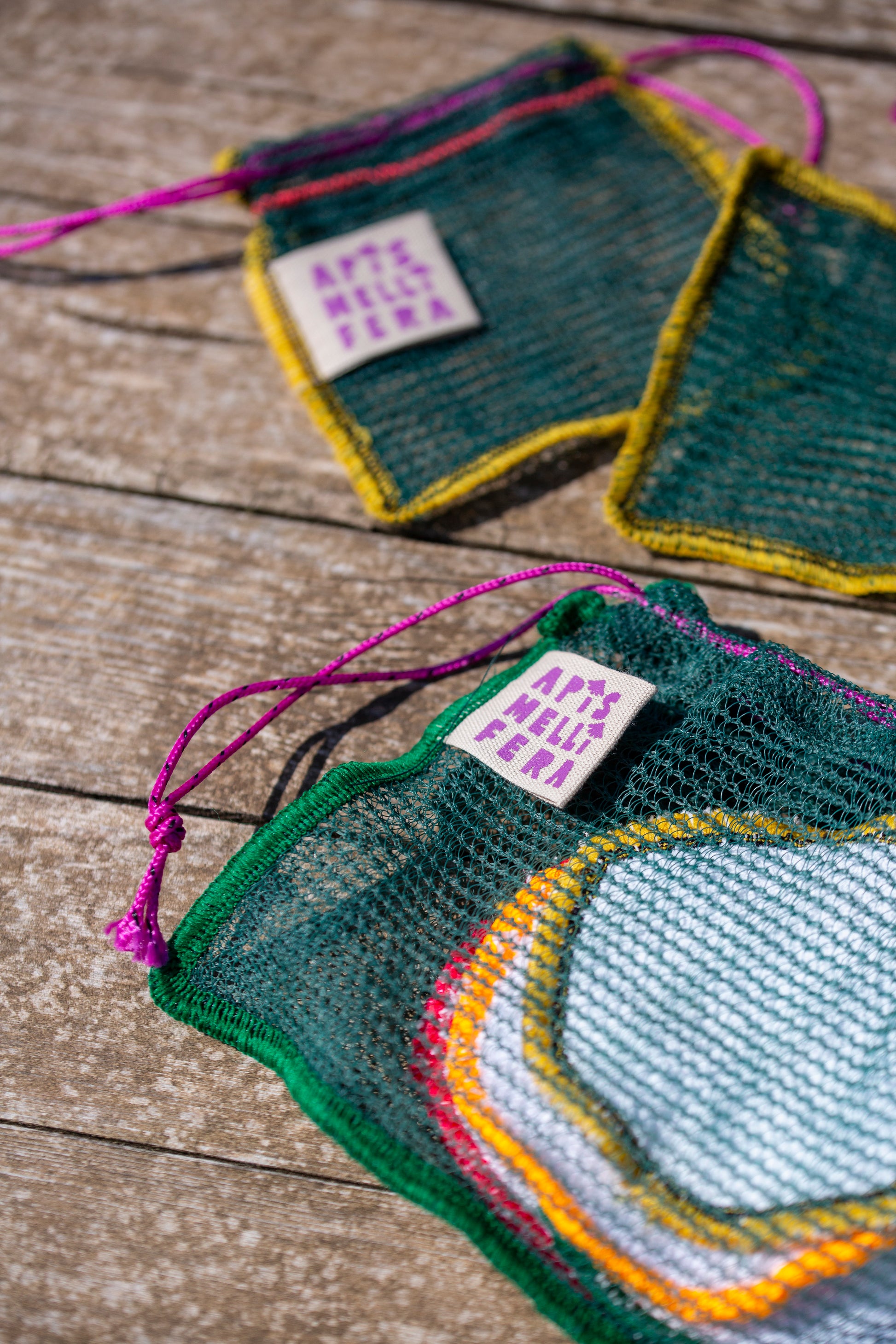 Questi sacchetti multiuso fatti con scarti di reti della raccolta di olive, sono pratici ed ecologici, perfetti per ridurre l’uso di plastica monouso. Sono colorati e richiudibili con cordino, si adattano a molteplici utilizzi quotidiani.